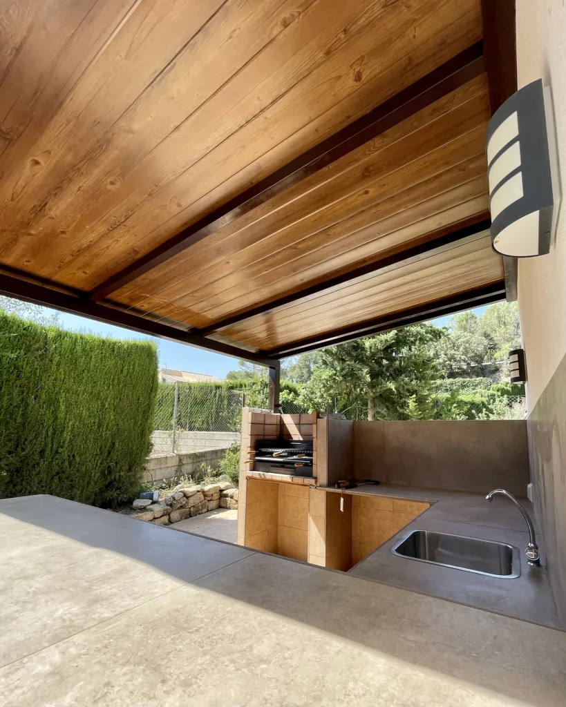 Al lado del porche, disponemos de una barbacoa de obra exterior techada con barra al aire libre.